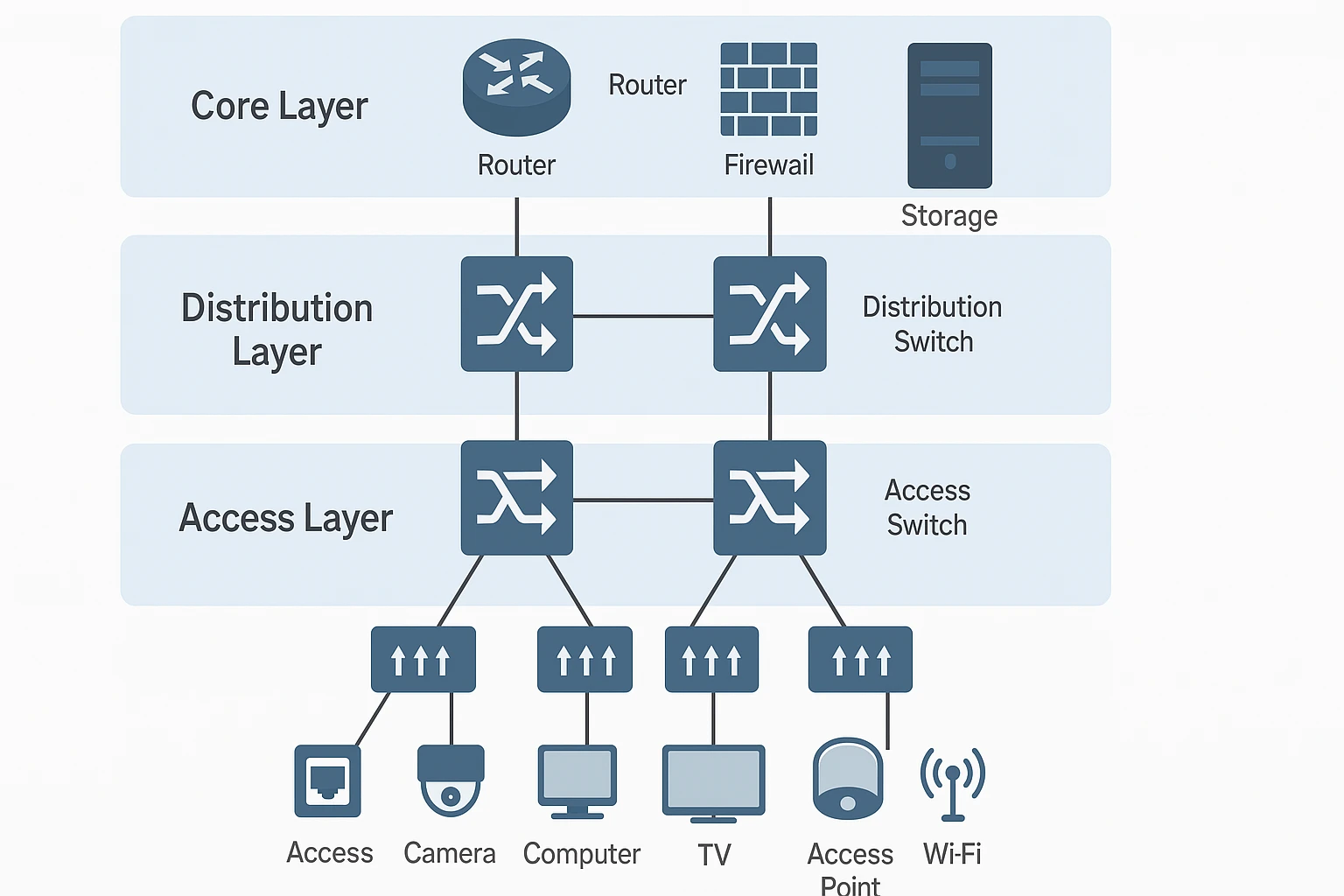Access Layer (Truy cập): Các ổ cắm mạng tại phòng, switch phụ kết nối thiết bị (camera, máy tính, TV, access point…).