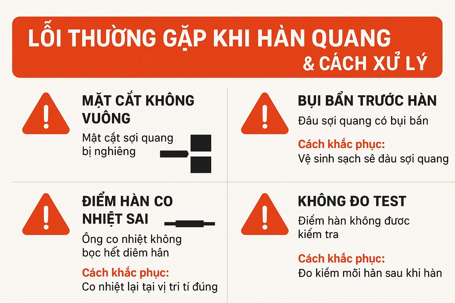 | Không đo test sau hàn | Không phát hiện suy hao | Luôn kiểm tra bằng OTDR/PM |