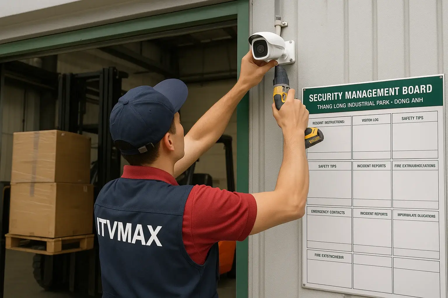 kỹ thuật viên ITVmax lắp camera tại cửa kho khu công nghiệp Thăng Long4 camera Hikvision ColorVu + 1 đầu ghi 2TB