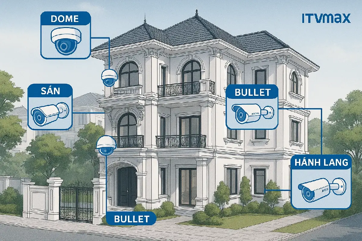 Gợi ý lắp 6–8 mắt camera bao phủ: cổng – sân – ban công – hành lang – lối thoát hiểm.