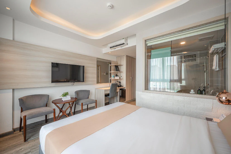 Phòng tôi ở nằm trên tầng 5, có ban công nhỏ nhìn ra sân trong – nơi ánh nắng chiếu vào mỗi buổi sáng sớm tạo nên một khung cảnh vừa hiện đại vừa nhẹ nhàng. Diện tích phòng không quá lớn, nhưng cách bài trí khiến không gian rất rộng và thoáng. Mọi thứ đều được tính toán vừa vặn – từ đèn ngủ ánh vàng, gương soi toàn thân, đến tủ đồ ẩn gọn vào tường.