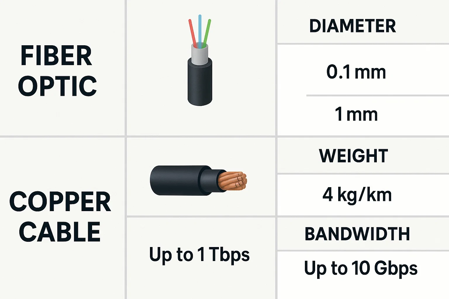 Sợi quang nhẹ hơn, nhỏ hơn nhiều lần so với dây đồng có cùng khả năng truyền tải. Điều này giúp bố trí dễ dàng hơn trong tòa nhà, ống dẫn, cabinet nhỏ.